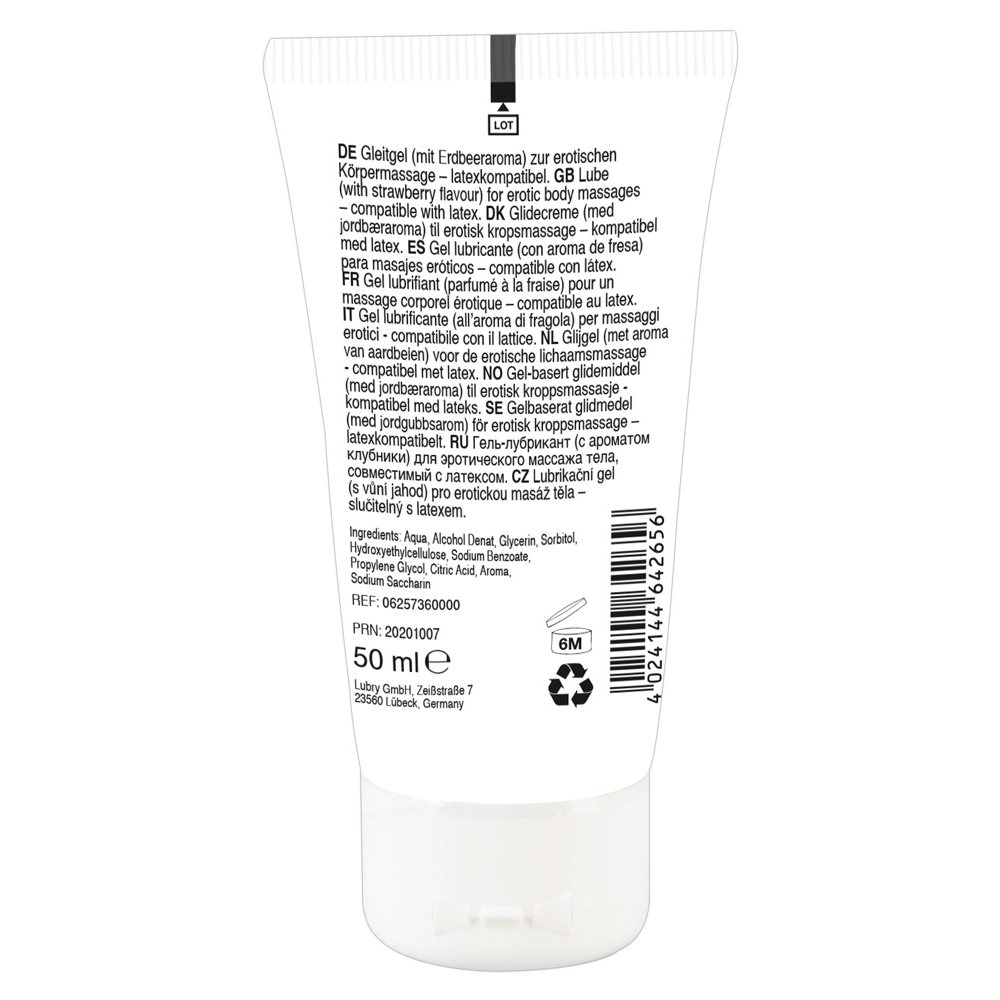 Vyznačuje se lahodnou chutí slaďoučkých jahod, které jen těžko odoláte a probouzí touhu po polibcích i u ostýchavých žen. Jeho použití umožňuje plný orální styk a jeho polknutí není na závadu. Je na vodní bázi a nelepí, takže je vhodný také pro použití se všemi erotickými pomůckami i s latexovým kondomem. Gel byl dermatologicky testován a splňuje nejpřísnější evropské normy.